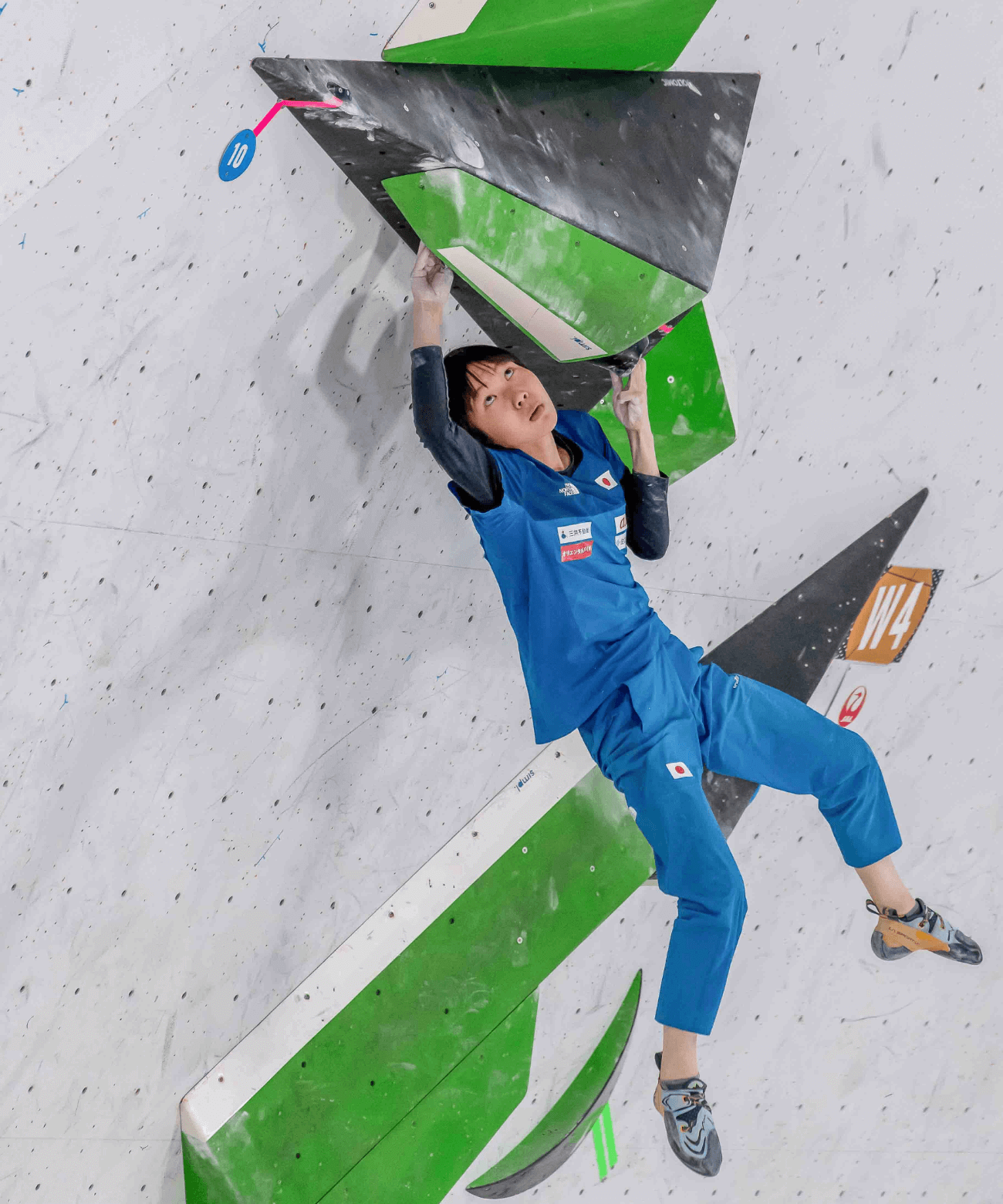 “新時代を切り開く”と”向上心の天才”は森秋彩の描く姿。2019年代表落選後、数年間の沈黙を経て出場した2022年リードW杯で圧倒的な優勝を収め”新生森秋彩”が誕生した。競技中は寡黙なイメージがある彼女だが、実はセカオワの大ファン。これからも突き進み続ける彼女の成長にご期待ください!